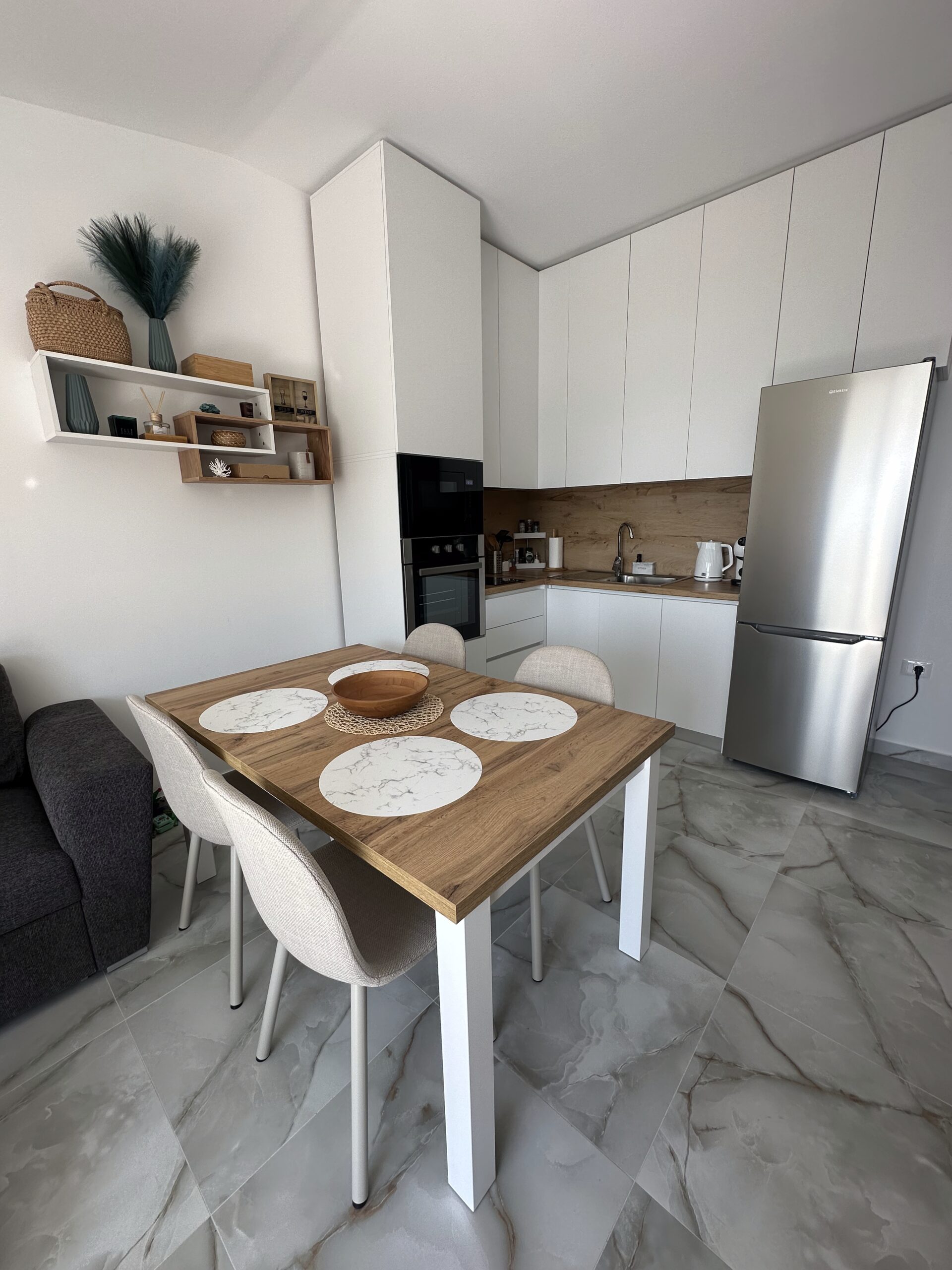 Náš apartmán nabízí krásný výhled na moře a do zátoky až k Durres. Díky své poloze v posledním patře působí příjemně vzdušně a světle. Jedná se o dvoupokojové ubytování vhodné pro páry i menší rodiny.